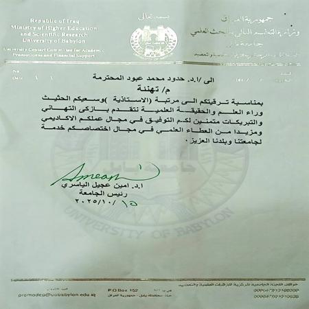 #تهنئةتتقدم عمادة ومنتسبي كلية التربية للعلوم الإنسانية في جامعة بابل بأزكى التهاني، وأطيب التبريكات إلى الدكتورة (حدود محمد عبود الطفيلي) التدريسية في قسم الجغرافيا بمناسبة ترقيتها العلمية المستحقة من مرتبة (أستاذ مساعد) إلى مرتبة (أستاذ) في تخصص (الجغرافيا الطبيعية - مناخ)متمنين لها ولجميع السادة التدريسيين في كليتنا المعطاء دوام الموفقية والنجاح.#إعلام_الكلية .....